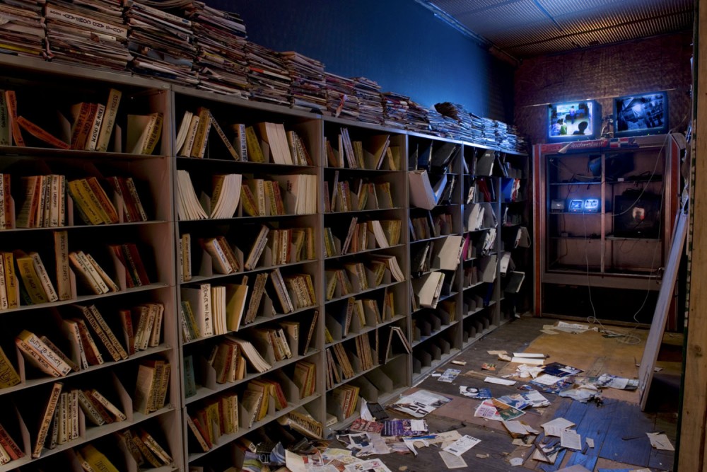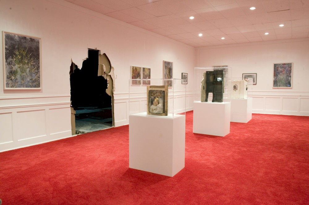 Just when the visitor is fully taken in by this dystopian vision of American dreams gone desperately wrong, there is a sudden rupture: through another cracked hole in the wall one enters a regal, white-walled, red-carpeted gallery space with elaborate moldings. Scribbled canvases line the pristine walls, and glass cases display artifacts like clues from a dead civilization. Other spaces in the installation include a hangar- like, high-ceilinged, Freemason-style meeting room, with an obscure circular symbol on the soiled red carpet, and a subterranean commercial-space-cum-hallucinatory- head-space that is at once Chinatown herb shop and Times Square peep show. The last stop is an upstairs wood cabin with a soothing domed ceiling in many-hued, pastel, fabric triangles that let daylight filter through. A chill-out space that seems to stand for the spiritual side of highs, it looks as though it was designed by a Native American shaman, and is rather at odds with the plastic, corrupted vibe of the rest of the installation. Here guests sit down and relax on pillows while looking at the many shelves stocked with a bottled, pickled archive of American pop-cultural debris.