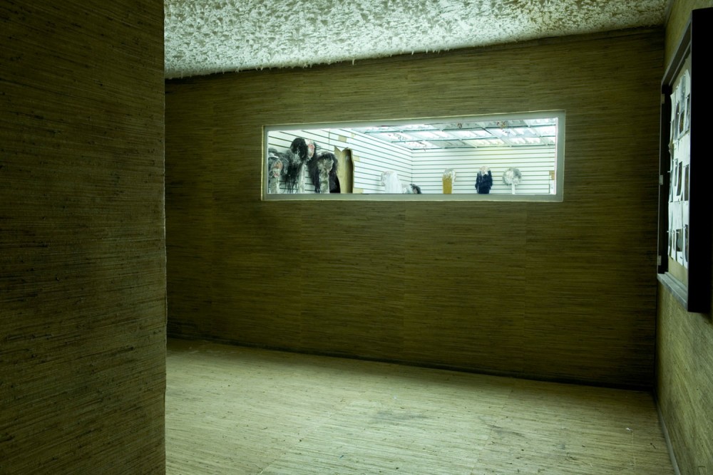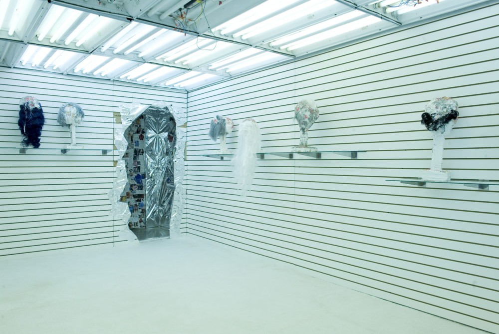 Entering the installation through a small door, one arrives in a moldy, veneer-paneled hallway where a series of charts and diagrams are hung, with what seem to be family photographs tacked onto them. A hole bashed through the wall leads to a retail-type space, brightly lit with fluorescent tubes, where glass shelves at varying heights display creepy faceless heads — happily decomposing with glitter and bright beads — each wearing a messy wig. Is it voodoo? Witchcraft? Satanism? From here the confused visitor proceeds into the labyrinthine heart of the installation, modeled on a small, one-story, wall-to- wall-carpeted house that seems air-lifted from the suburban front lines of the meth epidemic, in somewhere like Missouri. The house includes a soiled and dilapidated living room, a bathroom with rotting fixtures and appliances, and a kitchen space, complete with pots, pans, blenders, funnels hooked up to a