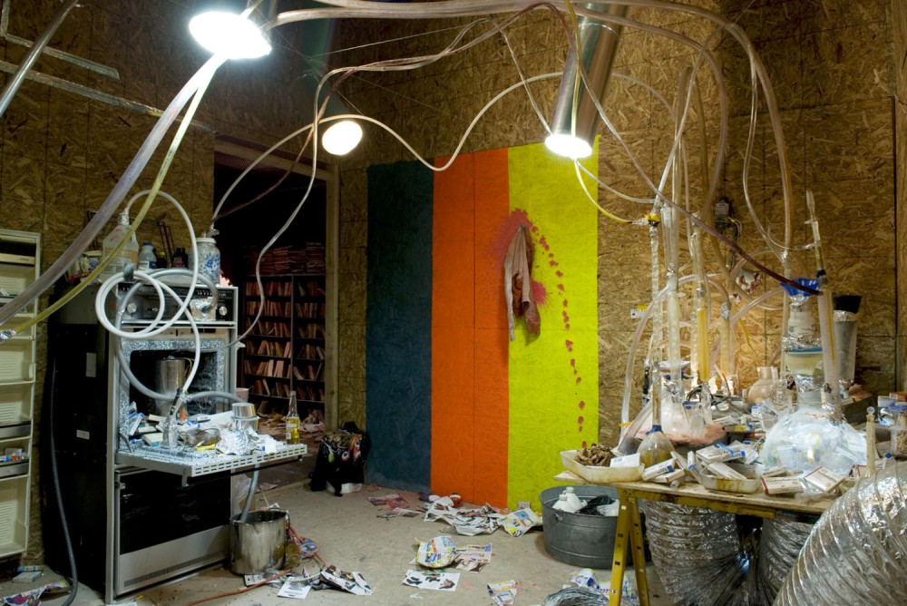 The Deitch Projectsʼs show is the third installment of a work begun last spring in Marfa, Texas, under the title “Hello Meth Lab in the Sun” (in collaboration with Alexandre Singh). For its New York reincarnation, Freeman and Lowe added the mystery of a fictional cult, the “Black Acid Co-op” (despite its name, the lifeblood here is clearly meth). The multi-level exhibition feels at times like a Hollywood set and at others like a Disney ride through a psychoactive hallucination. But unlike a movie or a theme park, there is no prescribed order to the sequence, and disorientation is part of the experience.