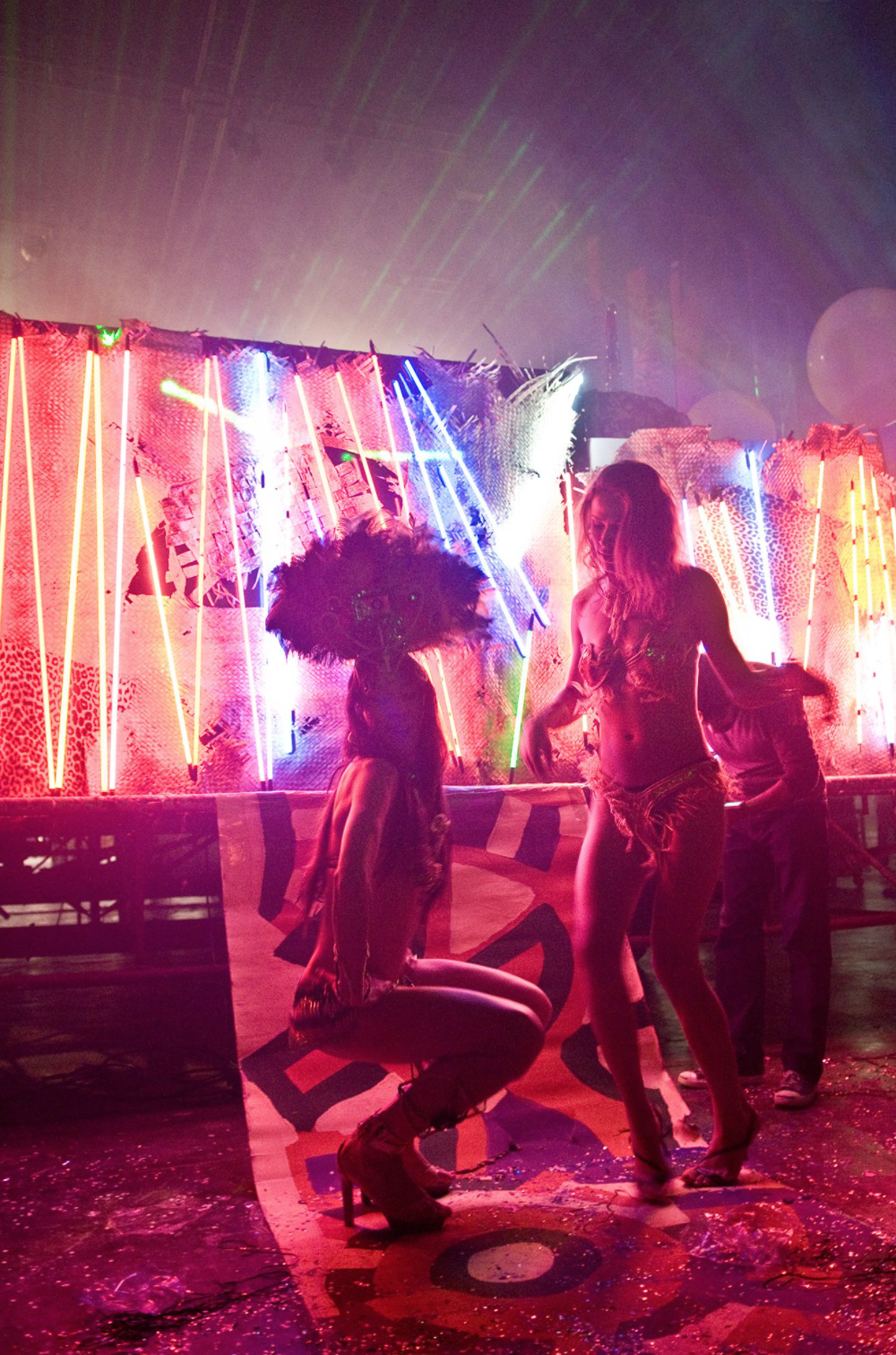 International art collective Assume Vivid Astro Focus (AVAF) is best known for its raucous, large-scale, multimedia installations, which function very much on an architectural level. It was founded in 2000 by one Brazilian and one French artist, who prefer to be known by their collective moniker only, an attempt to avoid individual authorship and give equal billing to their many collaborators — a flexible, ever-expanding army of artists, musicians, performers, sculptors, muses, transsexuals, and filmmakers, all of whom help make their vision come alive. the spaces they create together challenge art-market boundaries, seamlessly blurring the lines between media — sculpture, performance, video, and architecture. But more importantly, they keep pushing the boundaries between accepted social roles. In each piece, participants are stripped of their given social function, making roles interchangeable, non- existent, or simply unimportant — artist becomes curator, curator becomes artist, collector becomes collaborator, muse becomes graphic designer, critic becomes muse, audience becomes performer...all morphing into an unprecedented social, hierarchical, and material fluidity. the audience is just as important as the live band, which is just as important as the wallpaper, which is just as important as an art-historically significant work brought into the space, and so on. In a sense everything that enters avaf’s realm becomes part of the overall piece, creating a modern hybrid that is less classic installation art and more long-term happening — part community center, part disco, part music venue, and part activist headquarters. At the root of this disregard for the structures of society in general — and of the art world in particular — are avaf’s generous ideas about the future: they are ecstatic about the democratization of technology, and the speedy unrestricted sharing of information, which, in its finest incarnation, is the sharing of knowledge. their built environments embrace this and compete with the volume of stimulation offered in cyberspace, honing in on and paying homage to everything that inspires them. they replace the negative white noise of contemporary pop consumer culture with their own brand of white noise — one that celebrates the interconnected web of human creative output. For those who’ve never had a chance to experience their special blend of spatiality firsthand, a retrospective book on their first decade of work has now been published by Rizzoli, with all the group’s projects featured in one succinct volume, titled simply avaf. A visual assault and complete sensory overload, this ultimate fanzine features deliberately over- stimulating visuals that perfectly translate the collective’s multilayered three-dimensional environments onto paper.