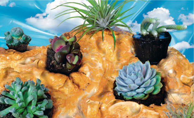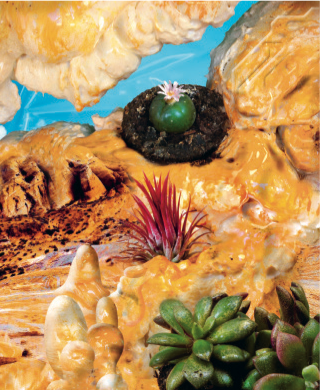 The vastness and isolation of deserts have long made them attractive places for inner exploration through psychedelic experimentation, and this tabletop tundra is no different. With hallucinatory vision, Sáez pays homage to desert hydration by depicting rock formations that are just as juicy and alive as many of the succulents themselves. In fact, so animated are they that if you look closely you might be lucky enough to discover the first subtle signs of a “machine elf,” one of those amorphous humanoid figures that have been seen by shamanic users of hallucinogens in many cultures, from Native Americans to Africans to indigenous Australians, as well as by non-shamanic users of DMT (dimethyltryptamine). When encountered, the friendly multi- dimensional entities seem to say, “How wonderful you’re here! We’re delighted to see you! You come so rarely!” and then guide you on a hyper-stimulating metaphysical journey through the unexplored territories of your mind.