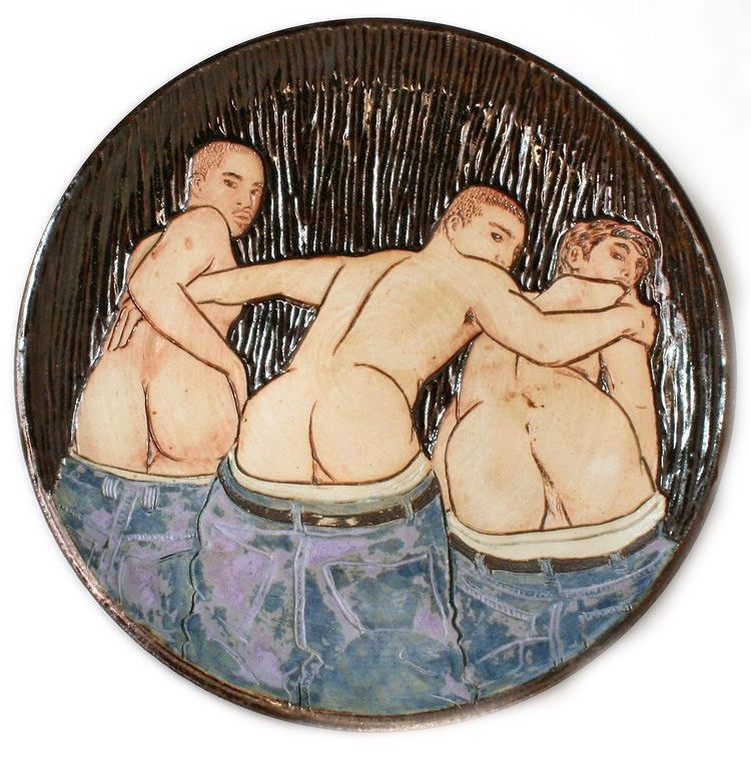 Despite the vague haze of booze and celebration, there is one distinctly memorable thing about last new Year’s eve: the handsome mugs offered in the east Village apartment of the party host, singer/songwriter Justin Vivian Bond. What made these crafty, tactile, rugged receptacles so unusual wasn’t that the champagne was served in them, but rather their decoration, which consisted of children’s-story-like motifs depicting all kinds of sexual debauchery: full-on orgy scenes, a young man being sodomized by the universe, two men making love in a barn while a goat looked on.... What would usually have read as hardcore pornography all of a sudden took on an innocent, dreamy touch. the artist who created these unique pieces is San Francisco-based ceramicist Dewey Arsee, a friend of Bond’s. Arsee says the main motivation behind making them is to have fun. Given their titillating themes, that’s easy to imagine. While his collection of mugs features only homoerotic imagery, Arsee adorns his plate series with a more polysexual palette (pussy plate, anyone?). Besides being quite the conversation piece, all of his products are made of high- fired stone wear and are thus highly durable: food-, dishwasher-, and microwave- safe. And Arsee is always open to discussing custom orders and ideas.