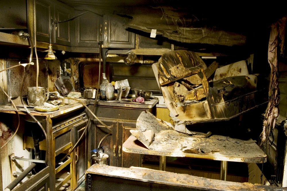 faucet, and a complicated system of tubes flowing in and out of vessels with different chemical ingredients — a meth lab ready to go. Next to it is a duplicate of the same kitchen, but ravaged by a fierce explosion — presumably from a failed meth-making attempt — with everything burnt, melted, and left to decompose. In the next room massive bookcases contain vast archives and video monitoring equipment, old computers, and bulletin boards with more obscure charts and diagrams, like the abandoned headquarters of a paranoid underground organization.