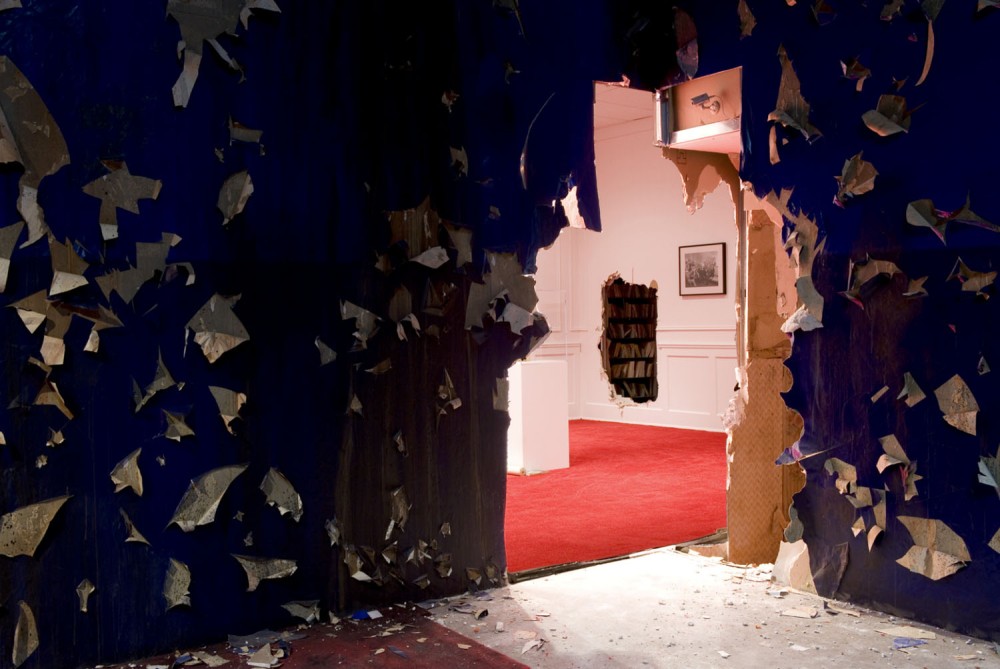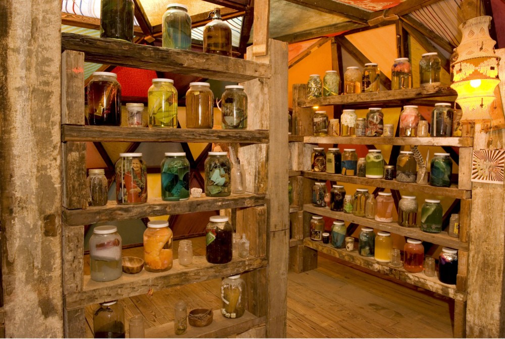 Just when the visitor is fully taken in by this dystopian vision of American dreams gone desperately wrong, there is a sudden rupture: through another cracked hole in the wall one enters a regal, white-walled, red-carpeted gallery space with elaborate moldings. Scribbled canvases line the pristine walls, and glass cases display artifacts like clues from a dead civilization. Other spaces in the installation include a hangar- like, high-ceilinged, Freemason-style meeting room, with an obscure circular symbol on the soiled red carpet, and a subterranean commercial-space-cum-hallucinatory- head-space that is at once Chinatown herb shop and Times Square peep show. The last stop is an upstairs wood cabin with a soothing domed ceiling in many-hued, pastel, fabric triangles that let daylight filter through. A chill-out space that seems to stand for the spiritual side of highs, it looks as though it was designed by a Native American shaman, and is rather at odds with the plastic, corrupted vibe of the rest of the installation. Here guests sit down and relax on pillows while looking at the many shelves stocked with a bottled, pickled archive of American pop-cultural debris.