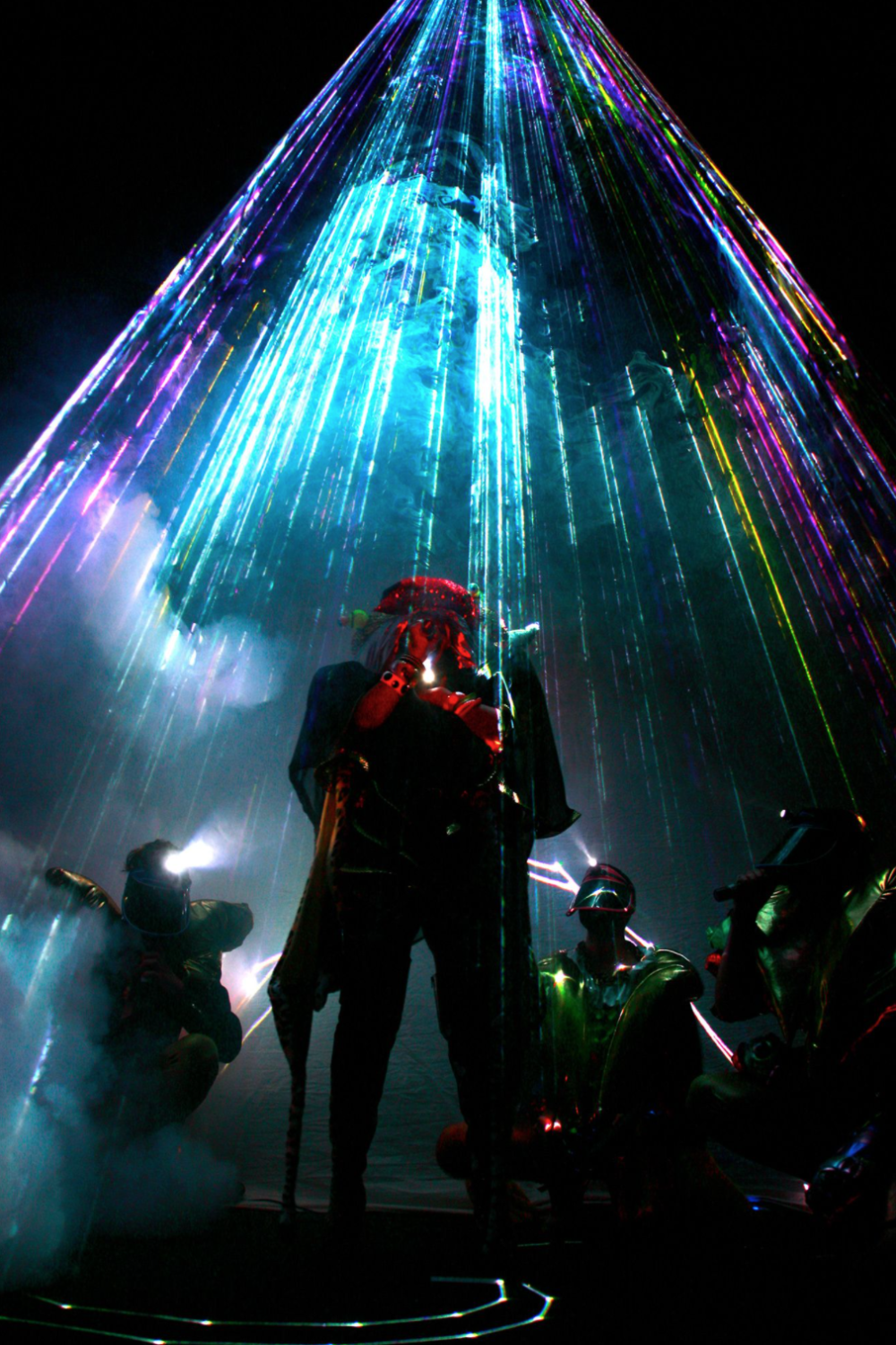 International art collective Assume Vivid Astro Focus (AVAF) is best known for its raucous, large-scale, multimedia installations, which function very much on an architectural level. It was founded in 2000 by one Brazilian and one French artist, who prefer to be known by their collective moniker only, an attempt to avoid individual authorship and give equal billing to their many collaborators — a flexible, ever-expanding army of artists, musicians, performers, sculptors, muses, transsexuals, and filmmakers, all of whom help make their vision come alive. the spaces they create together challenge art-market boundaries, seamlessly blurring the lines between media — sculpture, performance, video, and architecture. But more importantly, they keep pushing the boundaries between accepted social roles. In each piece, participants are stripped of their given social function, making roles interchangeable, non- existent, or simply unimportant — artist becomes curator, curator becomes artist, collector becomes collaborator, muse becomes graphic designer, critic becomes muse, audience becomes performer...all morphing into an unprecedented social, hierarchical, and material fluidity. the audience is just as important as the live band, which is just as important as the wallpaper, which is just as important as an art-historically significant work brought into the space, and so on. In a sense everything that enters avaf’s realm becomes part of the overall piece, creating a modern hybrid that is less classic installation art and more long-term happening — part community center, part disco, part music venue, and part activist headquarters. At the root of this disregard for the structures of society in general — and of the art world in particular — are avaf’s generous ideas about the future: they are ecstatic about the democratization of technology, and the speedy unrestricted sharing of information, which, in its finest incarnation, is the sharing of knowledge. their built environments embrace this and compete with the volume of stimulation offered in cyberspace, honing in on and paying homage to everything that inspires them. they replace the negative white noise of contemporary pop consumer culture with their own brand of white noise — one that celebrates the interconnected web of human creative output. For those who’ve never had a chance to experience their special blend of spatiality firsthand, a retrospective book on their first decade of work has now been published by Rizzoli, with all the group’s projects featured in one succinct volume, titled simply avaf. A visual assault and complete sensory overload, this ultimate fanzine features deliberately over- stimulating visuals that perfectly translate the collective’s multilayered three-dimensional environments onto paper.