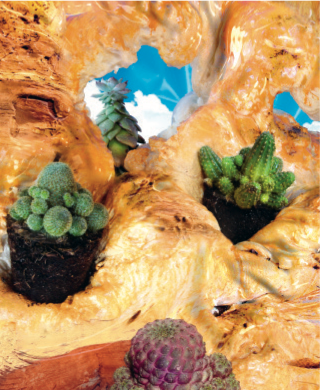 The vastness and isolation of deserts have long made them attractive places for inner exploration through psychedelic experimentation, and this tabletop tundra is no different. With hallucinatory vision, Sáez pays homage to desert hydration by depicting rock formations that are just as juicy and alive as many of the succulents themselves. In fact, so animated are they that if you look closely you might be lucky enough to discover the first subtle signs of a “machine elf,” one of those amorphous humanoid figures that have been seen by shamanic users of hallucinogens in many cultures, from Native Americans to Africans to indigenous Australians, as well as by non-shamanic users of DMT (dimethyltryptamine). When encountered, the friendly multi- dimensional entities seem to say, “How wonderful you’re here! We’re delighted to see you! You come so rarely!” and then guide you on a hyper-stimulating metaphysical journey through the unexplored territories of your mind.