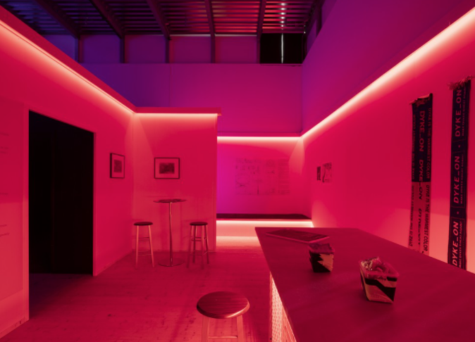 The Bar has been a crucial meeting place for the gay community for decades. In Cruising Pavilion’s version, you are greeted by Tom Burr’s Anthology: Writings 1991–2015 (2015), which the curators insist is “a gay psycho-geographical counterpart to Koolhaas’s Delirious New York.” Behind the bar hang two soccer scarfs designed by DYKE_ON, appropriating hooligan accessories to mark community through fashion. Two detailed graphic drawings by the British duo Hannah Quinlan and Rosie Hastings titled Family #1 and Family #2 (2019) reference Tom of Finland, but update the gay canon to include gender-non-conforming and trans bodies in their depiction of friends socializing in banal domestic spaces. The Bar section was rounded out with familiar works from the New York show: plans of the Saint, Gesto’s collage, and Vriesendorp’s skyscraper drawing.