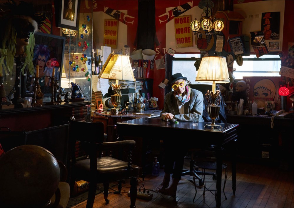 It does feel like a queer version of The Godfather, and I’m here to pay my respects and have you share your wisdom. Tell me about your ceiling. I cut aluminium foil into little squares, crinkled it up, and then flattened it, put some glue on the back, and stuck it up there. It’s silver leaf. What happened in the last 25 years was a fucking lot of cigarette smoking. You get five or six people in here that are like me, puffing away. It’s like a chimney in here.