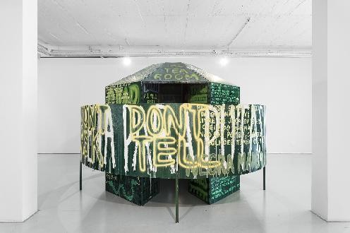 The sculptures Vadios and Take Ecstasy With Me both present human scale architectural form’s that force a relationship between the viewer and the act of cruising. In Vadios a circular eight-unit structure is semi-shielded by a circular half wall, viewer participation completes the work by inviting them to use the space of the Vadios; a term which means vagabond or hoodlum and was used instead of the word homosexual in all legal documents in the period in which same-sex sexual activity was outlawed (1912-1982). The form of this sculpture encourages participants to walk into the center and choose a private cabin. These small spaces are scented with the fumes of alkyl nitrites, an inhalant, referred to in the gay community as Poppers, which are used to heighten euphoria during sexual contact. Small circular holes are cut into the walls at the approximate average height of a crotch allowing for access to rooms on either side. These “Glory Holes” invite you to engage in public acts of sexual freedom. The design of this piece pays homage to Foucault’s theory of the Panopticon a concept that’s summed up simply means: we are given the freedom to act but self-regulate because we are not sure who is watching. When this process is endured over time we eventually internalize the prison becoming our own guards. This structure delivers a symbolic simulation of the experience of cruising during the dictatorship, offering a real opportunity to overcome self-censorship in return for sexual gratification. The walls of this sculpture are covered in queer graffiti as well as selection of texts from the Portuguese poets Judith Teixeira, António having their books banned in the 1923 incident known as “Poets of Sodoma”.
