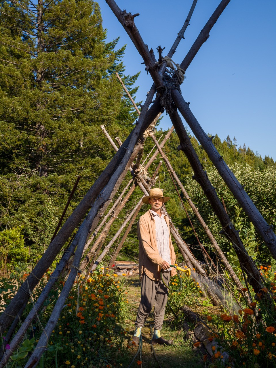 You can feel all the hands that have been involved in making them. There’s a term ‘spolia’; it’s related to the concept of spoils of war, where architectural fragments and materials are taken from one culture to build new structures for another. For example, you would take columns from a palace and repurpose them in a church. Sometimes this was a symbolic way of showing off your domination, but sometimes it was just practical: you need marble and there’s marble. We do that all the time here. Our neighbour, Moonlight, who was a part of the original commune, recently replaced their wood deck and we took the best of the old pieces and built a new deck here. It’s a continuous circle, where materials, the redwood trees, the farm, even human waste from the outhouses are composted and re-used.