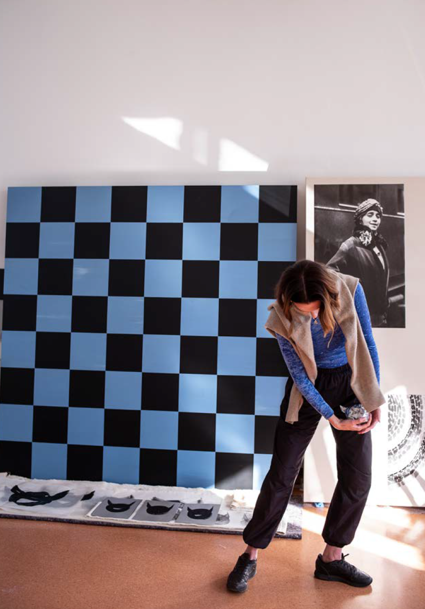 Chess for Sarah is more than just a game; it’s a long-term love affair. Early on, it became a guiding light in her art and her life. It also brought her to Vienna, the Austrian capital where she’s lived on and off. She first moved there to finish her dissertation, which examined the relationship between chess, aesthetics, and politics, and it earned her a PhD in philosophy, making her an extremely rare person: a doctor of chess. In the years that followed she has produced an oeuvre that is deeply invested in exploring strategy, dedication, competition, winning and losing, and the big emotional arcs that humans experience as a result thereof. Sarah has shown in galleries and institutions all over Europe, the U.S., Asia and West Asia, activating each space with her sculptures, paintings and drawings, that embody her signature themes. Her reinterpretation and recontextualization of cliched icons, is like hearing a mega-hit pop song played by a classical orchestra. When I toured Sarah’s discerning apartment in March 2022 I noticed that her family of iconography was also very present in her home, with chess board patterns, devils, ostrich eggs, and palm trees everywhere. My visit came just days before her latest pieces were about to be shipped to New York City. This June her romance with athletics will be on full display at Galerie Eva Presenhuber in a new exhibition she named Sports Club New York.